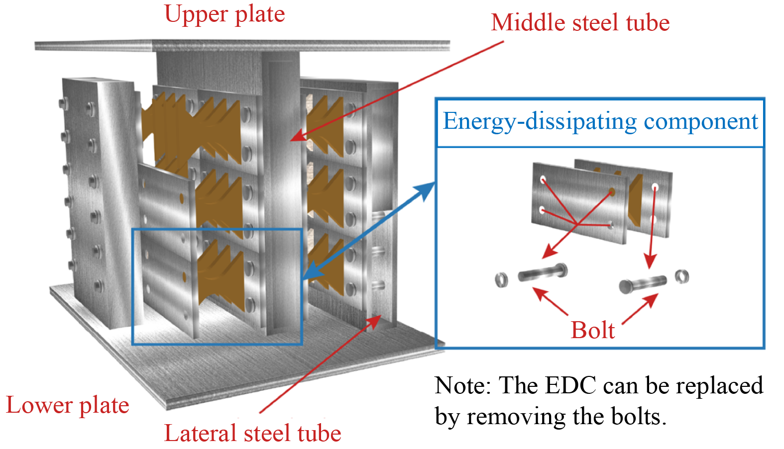 The high-speed railway track-bridge system (HSRTBS) is susceptible to damage under the effects of earthquakes, thus threatening the safety of running trains. To improve the seismic performance of HSRTBS and reduce damage to the system, a replaceable X-shaped Energy Dissipating Steel Damper (X-EDSD) is proposed, which contains the energy-dissipating component (EDC) to dissipate the earthquake energy. Cyclic tests were performed to obtain the hysteretic performance of the EDC and X-EDSD, and a test-validated numerical model was developed to conduct parametric analyses. The X-EDSD was simplified as a nonlinear spring element with hysteretic parameters and modeled into the numerical model of the HSRTBS for seismic dynamic analyses. The peak displacements of girder and rail decreased by approximately 48.1% and 47.7%, respectively. The peak deflections of the fasteners, cement asphalt mortar layer and sliding layer were reduced by 70.4%, 70.8%, and 86.1%, respectively. A comprehensive consideration of the system response control-economic cost ratio coefficient Rpe is proposed, and the optimal thickness of 14.94 mm is obtained by applying cubic term coefficient fitting according to 5 groups of steel plate thickness data for the specific case study in this paper. The method can be used for cost-informed X-EDSD-selection for seismic mitigation of HSRTBS.
