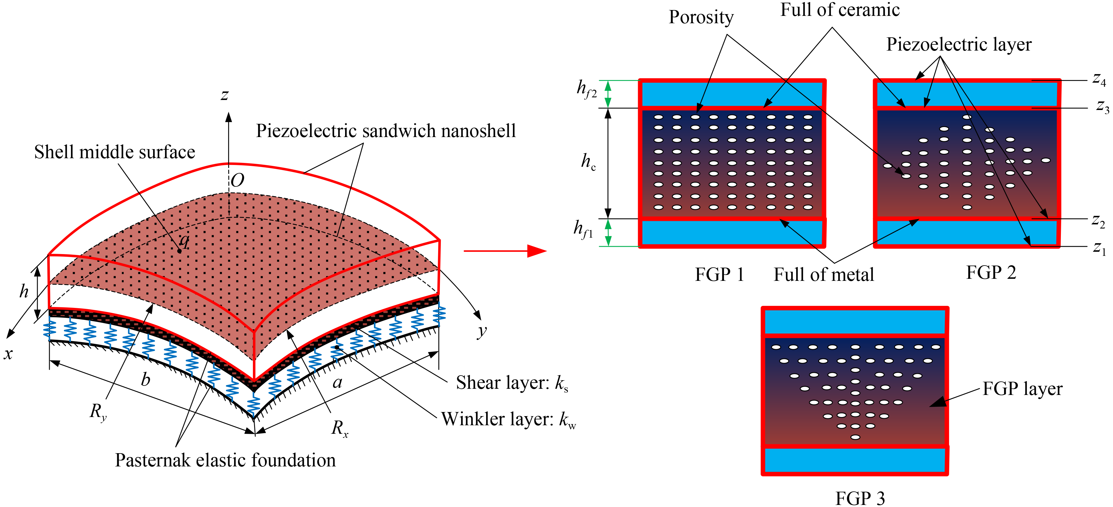 In addition to accounting for non-gradient nonlocal elastic stress, a nonlocal strain gradient theory (NSGT) also considers the nonlocality of higher-order strain gradients; thus, it is applicable to small-scale structures and can account for both hardening and softening effects. An analytical model is constructed in this research endeavor to depict the free vibration characteristics of sandwich functionally graded porous (FGP) doubly-curved nanoshell integrated with piezoelectric surface layers consists of three distinct layers, taking into account flexoelectrici effect based on NSGT and novel refined high-order shear deformation hypothesis. The novelty of this study is that the two nonlocal coefficients and material length scale of the core layer are variable along thickness, like other material characteristics. The equilibrium equation of motion of the doubly-curved nanoshell is derived from Hamilton’s principle, then the Galerkin method is applied to derive the natural vibration frequency values of the doubly-curved nanoshell with different boundary conditions (BCs). The influence of parameters such as flexoelectric effect, nonlocal and length scale factors, elastic medium stiffness factor, porosity factor, and BCs on the free vibration esponse of the nanoshell is detected and comprehensively studied. This paper is claimed to provide a theoretical predicition on the impact of the size-small dependent and flexoelectric effect upon the oscillation of FGP nanoshell integrated with piezoelectric surface layers, thus sheding light on understanding the underlying physics of electromechanical coupling at the nanoshell to some extent.