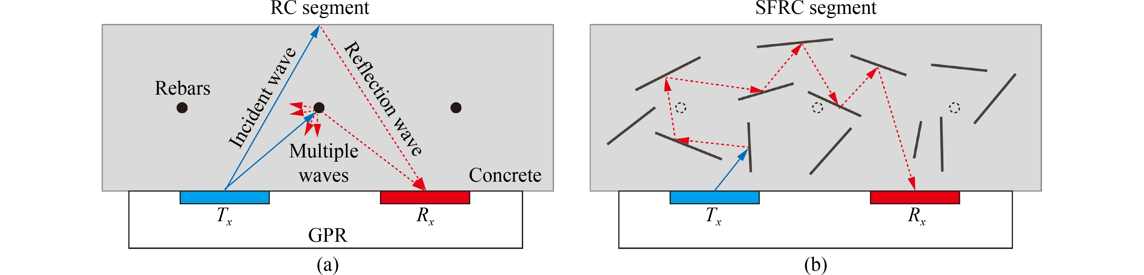Steel fiber reinforced concrete-reinforced concrete (SFRC-RC) composite linings are popular in shield tunnel construction due to exceptional strength and waterproofing properties. Non-destructive testing methods are essential for assessing the quality of these linings and ensuring tunnel construction safety. This study investigates the potential and parameters of ground penetrating radar (GPR) detection for the composite linings, using the Deep Tunnel Sewerage System-Phase 2 project in Singapore as a case study. The gprMax simulations incorporated the random distribution and precise parameters of steel fibers to conduct preliminary frequency selection studies. The structural setup of the model experiments mirrored that of the actual tunnel, allowing for an analysis of GPR penetration capabilities at various frequencies. Field testing provided authentic GPR data, validating conclusions drawn from simulations and model experiments and examining GPR power attenuation patterns. Findings indicate that GPR is effective for the quality detection of composite linings. The optimal frequency for detecting SFRC-RC composite linings is 300 MHz, which resolves the interfaces of different layered media. Based on single-parameter exponential and power function fitting, empirical formulas for power attenuation quantitatively characterize GPR signal attenuation in SFRC-RC composite linings. This paper offers valuable references for GPR detection of SFRC-RC composite linings.