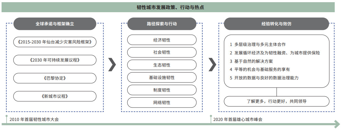 The Resilient Cities Congress (2010 ~ 2019) and the Daring Cities (2020 to present) were the pioneering annual global platforms showcasing the latest advancements in international research and practices of resilient cities. They have been instrumental in fostering the growth and collaborative efforts of resilient cities across the globe. Drawing from the materials and scholarly work presented at these congresses, this research comprehensively reviews the evolution of resilient cities over the last decade through the lenses of policies and actions, summarizing the cutting-edge and current trends. The journey of global resilient cities unfolds in three phases of global commitment and framework establishment, path exploration and action, and experience translation and adaption. Resilience building and financing based on multi-level actions, multi-stakeholder collaboration, and community participation have consistently been the core themes of the Resilient Cities Congress series. Emphasizing the leading role of local governments in such actions and taking into account the social, environmental, and economic dimensions, multi-disciplinary and cross-sectoral cooperation and innovation is the key to achieving resilience and overall sustainable development. Moreover, in response to the new challenges and opportunities of the digital age, efforts to strengthen the cyber resilience by building a healthy and safe cyber environment are vital enhancers of sustainable urban development. Finally, the article reflects how the insights and accomplishments stemming from the Resilient Cities Congress series can inform resilient city research and practices in China. It advocates for a strategic approach that aligns with China's unique conditions and urban characteristics, encouraging the adaptation and contextualization of resilient initiatives to craft localized and regionspecific plans for building resilient cities across the nation.