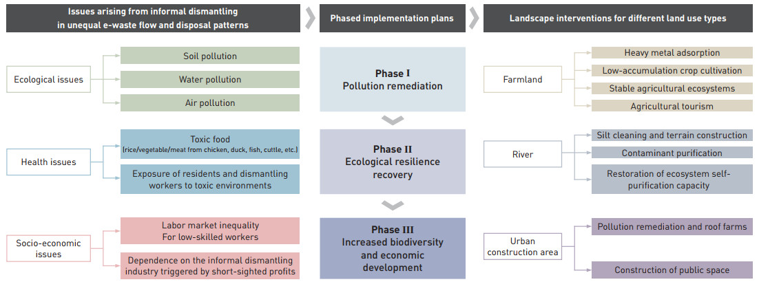 ● The global e-waste flow pattern is analyzed under the background of economic globalization and unequal environment distribution ● Proposed phased implementation plans for different conditions of ecology, food, community, and income for e-waste polluted sites ● The intervention measures of e-waste pollution are put forward from the perspective of landscape architecture