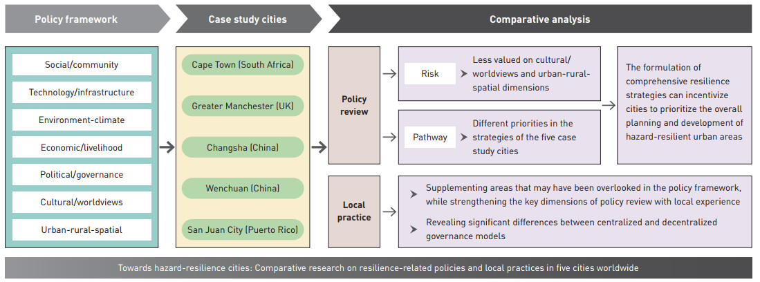This study provides a comparative analysis of the journey toward hazard-resilience by examining the resilience-related policies and local practices in five exemplary cities worldwide: Cape Town (South Africa), Greater Manchester (UK), Changsha and Wenchuan (China), and San Juan City (Puerto Rico). Through a conceptual framework encompassing seven interrelated dimensions of the social-environmental system, this paper delves into how hazard risk is perceived and resilience is approached in both policy documents and local practices. Policy reviews reveal distinct strategies among cities. Cape Town employs diverse water-saving measures, addressing drought through water resilience. Greater Manchester focuses on human and organizational aspects in disaster risk reduction. Changsha and Wenchuan prioritize specific disaster response measures, while San Juan tackles environmental and socio-economic challenges through multidimensional actions. Local practices illustrate the effectiveness of bottom-up resilience enhancement, with examples including home drilling in Cape Town and community engagement in Changsha. Despite these efforts, there is a common trend across cities of limited consideration for cultural/worldviews and urban-rural-spatial dimensions. Bridging this gap is crucial for effective risk management and disaster recovery. This study underscores the importance of aligning policy formulation with local practices, prioritizing targeted recovery plans, and expanding considerations to include the urban-rural-spatial dimension. Overall, this research contributes valuable insights to the development of hazard-resilient cities, offering policymakers and planners a foundation to prepare cities for future challenges and foster urban resilience.