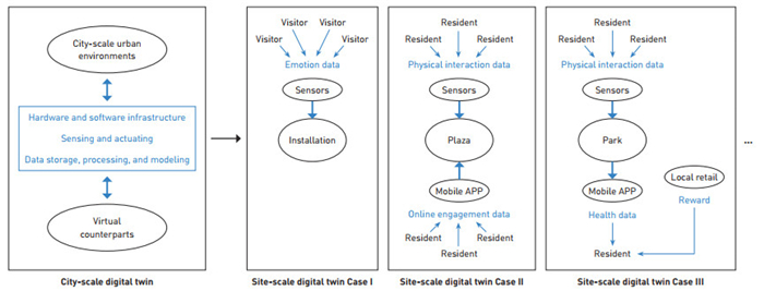 ● Advocates for site-scale DT to enhance integration with existing urban design and planning practices ● Reviews the genealogy of the DT concept and current challenges for DT practices, highlighting the need for improved public engagement and inter-departmental collaboration ● Compares three site-scale design interventions, showcasing the capture of emotion, interaction, and health data while advancing a new virtual-physical urban interface ● Explores how site-scale DT can create more interactive, participatory, and responsive urban environments by integrating diverse data types and fostering public engagement