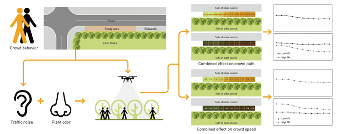Traffic noise is a typical negative sound source in urban environments with impacts on crowd behaviors. To explore the combined effects of auditory–olfactory interaction environments on crowd behaviors, this study conducted a covert behavioral observation experiment on a typical urban street uniformly planted with lilacs (Syringa spp.) to investigate the combined effects of plant odor and traffic noise on crowd path and crowd speed. The results showed that: 1) for crowd path, when the sound pressure level (SPL) was high, the path ranges and their mean values under different odor concentrations all showed a tendency to be farther away from the sound source than when it was low; the mean values of path ranges gradually moved towards the odor source as the odor went from none to strong, which was more significant at high SPL, with a maximum longitudinal movement of about 0.3 m. 2) For crowd speed, its mean values gradually slowed down from 1.24 m/s at high SPL as the odor went from none to strong and then stabilized at 1.18 m/s; however, those at low SPL were almost unaffected. This research puts forward new ideas to alleviate the negative impacts of traffic noise, and the study results can provide guiding significance for the improvement of the evaluation system of urban landscape quality and the optimization of urban design mode.