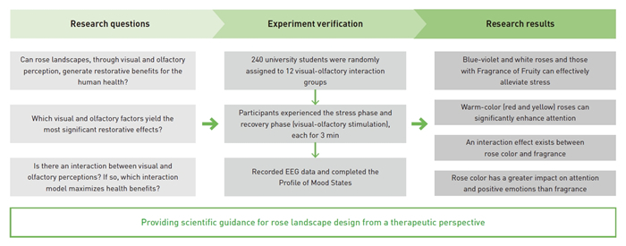 Plant landscapes play a vital role in promoting physical and mental health. Rosa chinensis, commonly known as "Chinese rose" and with diverse colors and fragrances, is widely used in urban landscaping and home gardening. However, its restorative benefits have yet to be explored from a sensory interaction perspective. This study investigated the effects of rose landscapes on stress relief, attention recovery, and emotional regulation. Participants (university students) were randomly assigned to 12 sensory groups combining six color series (white, orange, pink, red, yellow, and blue-violet) with two fragrance types—Fragrance of Rose (FR) and Fragrance of Fruity (FF). Through stress-inducing tasks followed by visual-olfactory recovery experiments, physiological and psychological data—including EEG and mood states—were analyzed. Results showed that white and blue-violet roses significantly alleviated stress, with the FF roses outperforming the FR ones. Warm colors (e.g., red, yellow), particularly the red–FR and yellow–FF combinations, excelled in boosting attention and positive emotions. Furthermore, visual stimuli had a greater impact on attention recovery and improvement of emotional health than olfactory stimuli. The study also confirmed the potential of sensory interactions in optimizing landscape perception and enhancing health benefits. Based on these findings, practical design strategies were proposed to maximize the therapeutic value of rose landscapes for various land uses. This research offers critical insights into leveraging plant landscapes for health promotion and provides new directions for designing urban green spaces and therapeutic environments.