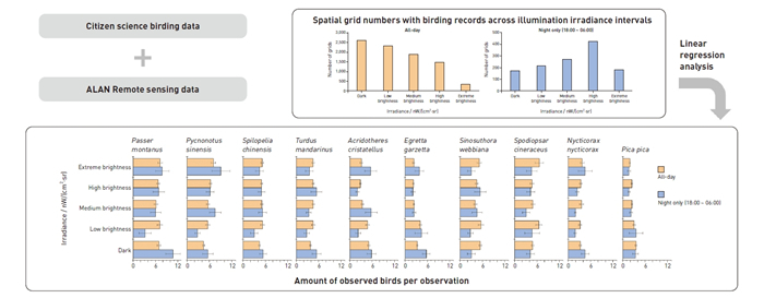 Artificial light at night (ALAN) is an essential infrastructure to support nighttime functions while serving as a significant indicator for urban vitality and economic development. However, the increasing prevalence of artificial lighting in urban areas threatens the health of urban residents of all kinds. Citizen science data are characterized by large sample size and complete spatio-temporal coverage, which have promising application prospects in ecological investigation and related research. In this context, focusing on Shanghai as the study area, this research explores the impact of nighttime light intensity on the distribution of urban birds. Using birding data from China Bird Report, from 2017 to 2023, ten common bird species were selected for the analysis. Based on ALAN remote sensing data, observed bird number varies as illumination radiance increases, revealing three patterns across species: decreasing, multimodal, and balanced. Specifically, most bird species were observed distributed in the lower light irradiance interval, i.e., 0 ~ 0.15 nW/(cm2·sr), while a few species, such as Nycticorax nycticorax and Passer montanus, exhibited an aggregation in higher light irradiance intervals at 75 nW/(cm2·sr) or above. The study revealed a preliminary correlation of the light irradiance and the distribution of urban bird species with a threshold of light irradiation for bird preference, providing evidences and strategic guidelines to reduce light pollution and improve bird-friendly nighttime environment in cities.
