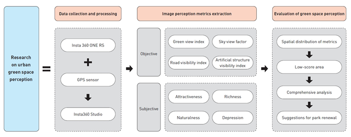 Visual quality assessment of urban green spaces is a major topic in landscape architecture research, yet traditional methods face limitations in practice. The rapid development of artificial intelligence and street-view big data offers opportunities for advancing green space perception studies. However, the lack of full street view image coverage of green spaces in China poses challenges for related research. Focusing on public landscape perception evaluation, this research took Zhujiang Park in Guangzhou, China as a case study. The research team utilized a convenient image collection method by panoramic camera and an effective processing workflow, and then employed the Segformer-B5 semantic segmentation model and the ViT-base-p16 image classification model to calculate four objective evaluation metrics (green view index, sky view factor, road visibility index, and artificial structure visibility index) and four subjective evaluation metrics (attractiveness, richness, naturalness, and depression) for visual quality assessment. Based on the spatial distribution results of these metrics, comprehensive analyses were conducted and low-score areas were identified. Research results indicate that vegetation and water features significantly enhance park attractiveness and positive perceptions, while excessive sky and artificial structures produce negative effects; oppressive artificial landscapes and constrained architectural views also lower overall landscape quality. The image collection and visual perception evaluation methods proposed in this study provide a scientific basis for the renovation and management of urban green spaces.
