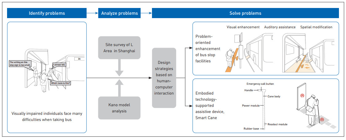 Bus stops are a critical component of urban infrastructure in modern cities. However, there is a notable research gap regarding the accessibility of bus stop facilities for visually impaired passengers. Using the L Area in Shanghai as a case study, research findings reveal significant deficiencies in both the long-distance recognition and accessible facilities of bus stops within the "15-minute community-life circle." Using the Kano model, this study classifies and prioritizes the needs for visually impaired passengers: large-font bus stop sign is a must-be need; audio announcements for bus arrivals are a one-dimensional need; audio announcements for the bus stop location, eliminating the vertical gap between the bus floor and the platform, and establishing an accessible boarding area are attractive needs. The study proposes design strategies for bus stop facilities, including a phased improvement approach for different bus stop types, and the embodied technology-supported assistive device—Smart Canes. This research not only responds to the global academic discourse on inclusive cities, but also contributes to promoting inclusive urban development in practice.
