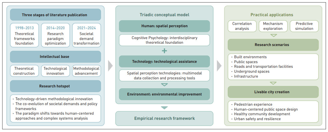 Against the backdrop of accelerating global urbanization, creating livable cities is critical for enhancing quality of urban life. Spatial perception can serve as a reference for livability evaluation while exploring how spaces are experienced. Recent breakthroughs in spatial perception technologies (SPTs) offer new pathways to quantify perception objectively but there is a lack of systematic reviews on how spatial perception research contributes to enhancing urban livability, thus hindering their scientific translation into practice. This research conducts a bibliometric review of 402 articles from Web of Science and Scopus, employing PRISMA guidelines for literature screening and CiteSpace for co-citation networks and keyword clustering. Key findings include: 1) Theoretically, Cognitive Psychology and environmental behavior theories underpin the perception–emotion–behavior continuum, with emotion as a core mediator linking environmental features with behavioral outcomes. 2) Technologically, the proliferation of SPTs has enabled quantification of subjective experiences, bridging gaps between traditional qualitative assessments and urban design. 3) Practically, the results of applying technologies to establish a human-centered design framework—derived through empirical studies—are valuable in both simulated and real-world scenarios. This research constructs a triadic "human–technology–environment" model that transcends traditional linear paradigms to guide livable urban design and planning. The model bridges Cognitive Psychology, environmental behavior theories, and SPTs to deepen understanding of dimensions of subjective livability, proposes innovative pathways for guiding practice, and offers evidence-based insights for human-centered urban research and design framework.