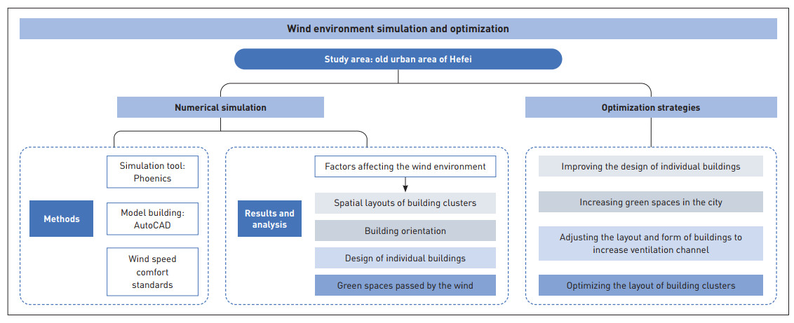 With the acceleration of urbanization, urban wind environment problems are becoming increasingly prominent, directly affecting air quality and residents' quality of life. The complex layout of old urban areas restricts wind circulation and is prone to forming unfavorable wind environment zones. This study takes the old urban area within Hefei City Ring Park as the study area by selecting three representative blocks, establishes three-dimensional models, and employs Computational Fluid Dynamics (CFD) numerical simulation to analyze wind velocity distribution in the study area and the key influencing factors. Simulation results show that, influenced by a combination of multiple factors, the wind environment of the old urban area varies significantly. This study then proposes corresponding optimization strategies for the wind environment conditions of each block, such as adjusting the layout and form of target buildings, optimizing the layout of building clusters, increasing green spaces in the city, and improving the design of individual buildings. Comparing existing and optimized simulations validates the effectiveness of these strategies. Finally, the research compares the existing and optimized wind environment conditions, providing empirical support and scientific guidance for optimizing wind environments of old urban areas and promoting high-quality urban renewal practices.