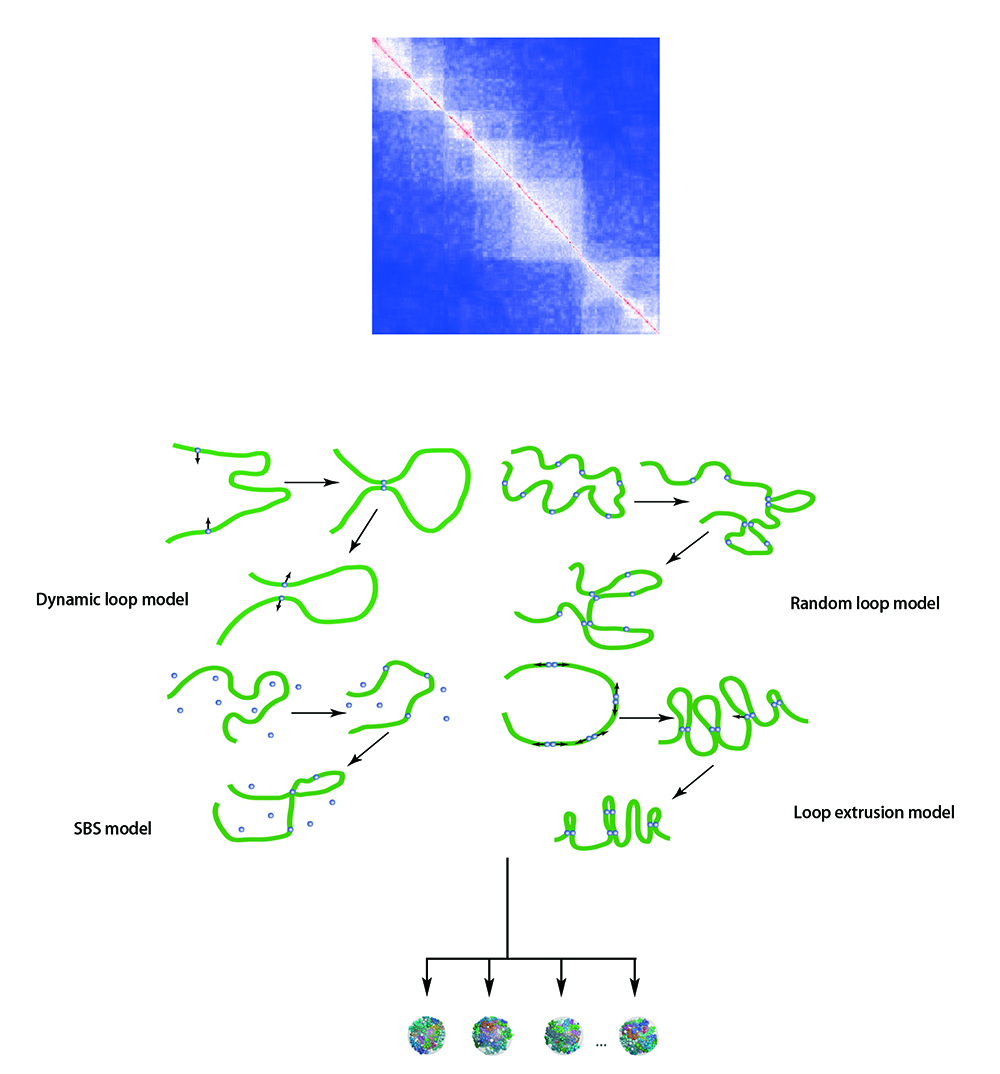 The compact conformation of nuclear genome is critical to nearly all intranuclear cellular processes, including transcription, DNA replication and DNA damage repair [ 1, 2]. Currently experimental technologies, such as fluorescence in situ hybridization (FISH) and chromosome conformation capture (3C) have improve our understanding of genome spatial organization [ 3– 5]. The genome can be roughly organized into hierarchical structures in multiple scales. At the bottom, genomic DNA wraps around nucleosomes in approximately 147 base pairs, forming a 10nm basic unit. These 10nm particles are, in turn, connected by linker DNA, further forming a secondary structure known as nucleosome fiber, which has been observed by cryogenic electron microscopy (cryo-EM) as a 30nm double helix structure [ 6], with the possibility of other formations existing in vivo [ 7]. Nucleosome fiber can further fold into a tertiary genomic structure, but this is much less characterized by current technologies. Several models have been proposed based on high-throughput 3C data, e.g., the “bottle-brush” model [ 8, 9]. Above the tertiary structure, the genome has been observed to occupy mutually exclusive nuclear space for each individual chromosome [ 10], even between sister chromosomes [ 11]. Both primary and secondary genome structure can be observed by current microscopy techniques, but technologies to directly observe details beyond the secondary genome structure are not available. Consequently, computation inference of chromatin structure has become the key toward understanding the principles of genome spatial organization. In this review, we introduce computational models of chromatin structure with indirect structural measurement. We first introduce basic polymer models with scales from several kilobases to chromosome-scale, followed by introducing current efforts to model structural ensembles in cell populations. Finally, we discuss integrative models on multi-omics data for 3D genome structures.
