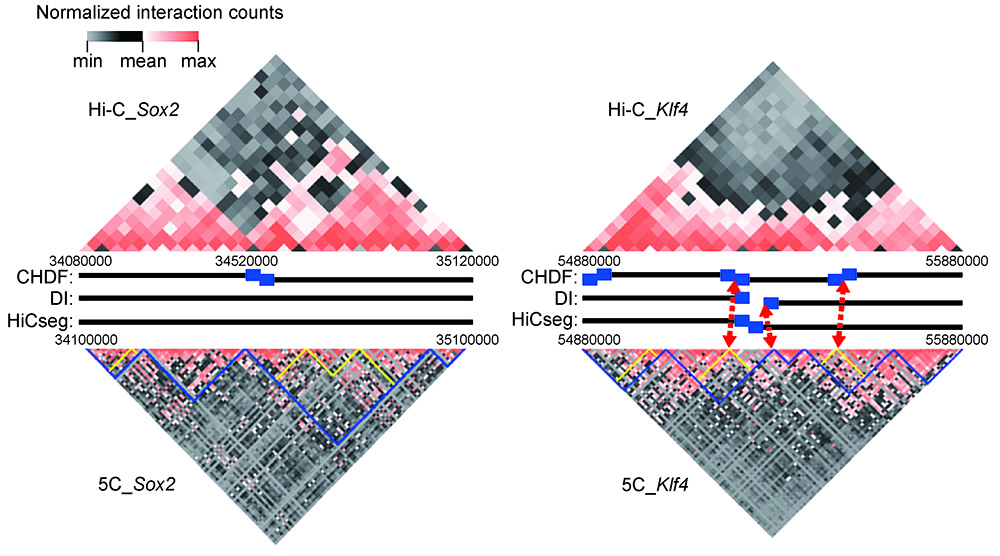 Over the last decade the 3C-based (Chromosome Conformation Capture, 3C) approaches have been developed to describe the frequency of chromatin interaction. The invention of Hi-C allows us to obtain genome-wide chromatin interaction map. However, it is challenging to develop efficient and robust analytical tools to interpret the Hi-C data. Here we present a new method called Clustering based Hi-C Domain Finder (CHDF), which is based on the difference of interaction intensity inside/outside domains, to identify Hi-C domains. We also compared CHDF with existing methods including Direction Index (DI) and HiCseg. CHDF can define more chromatin domains validated by higher resolution local chromatin structure data (Chromosome Conformation Capture Carbon Copy (5C) data). Using Hi-C data of lower sequencing depth, chromatin structure identified by CHDF is closer to that discovered by data of higher sequencing depth. Furthermore, the implement of CHDF is faster than the other two. Using CHDF, we are potentially able to discover more hints and clues about chromatin structural elements at domain level.