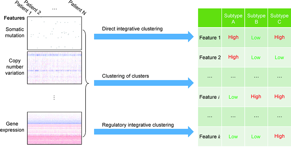 One goal of precise oncology is to re-classify cancer based on molecular features rather than its tissue origin. Integrative clustering of large-scale multi-omics data is an important way for molecule-based cancer classification. The data heterogeneity and the complexity of inter-omics variations are two major challenges for the integrative clustering analysis. According to the different strategies to deal with these difficulties, we summarized the clustering methods as three major categories: direct integrative clustering, clustering of clusters and regulatory integrative clustering. A few practical considerations on data pre-processing, post-clustering analysis and pathway-based analysis are also discussed.