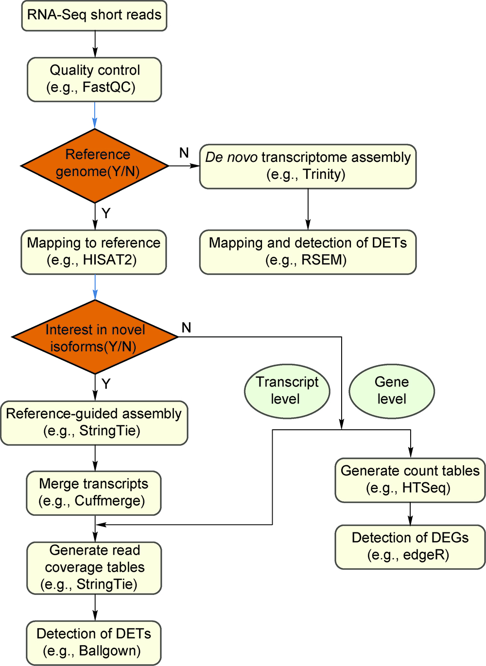 Recent advances in next-generation sequencing technology allow high-throughput RNA sequencing (RNA-Seq) to be widely applied in transcriptomic studies. For model organisms with a reference genome, the first step in analysis of RNA-Seq data involves mapping of short-read sequences to the reference genome. Reference-guided transcriptome assembly is an optional step, which is recommended if the aim is to identify novel transcripts. Following read mapping, the primary interest of biologists in many RNA-Seq studies is the investigation of differential expression between experimental groups. In this review, we discuss recent developments in RNA-Seq data analysis applied to model organisms, including methods and algorithms for direct mapping, reference-guided transcriptome assembly and differential expression analysis, and provide insights for the future direction of RNA-Seq.