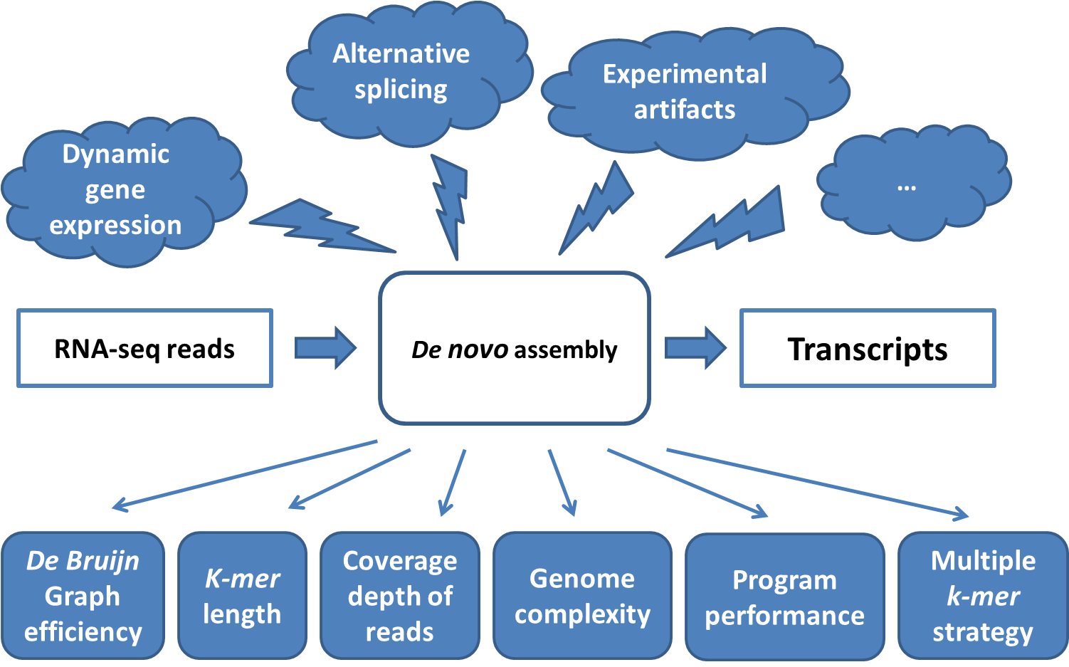 Reconstruction of transcriptome by de novo assembly from next generation sequencing (NGS) short-sequence reads provides an essential mean to catalog expressed genes, identify splicing isoforms, and capture the expression detail of transcripts for organisms with no reference genome available. De novo transcriptome assembly faces many unique challenges, including alternative splicing, variable expression level covering a dynamic range of several orders of magnitude, artifacts introduced by reverse transcription, etc. In the current review, we illustrate the grand strategy in applying De Bruijn Graph (DBG) approach in de novo transcriptome assembly. We further analyze many parameters proven critical in transcriptome assembly using DBG. Among them, k-mer length, coverage depth of reads, genome complexity, performance of different programs are addressed in greater details. A multi-k-mer strategy balancing efficiency and sensitivity is discussed and highly recommended for de novo transcriptome assembly. Future direction points to the combination of NGS and third generation sequencing technology that would greatly enhance the power of de novo transcriptomics study.
