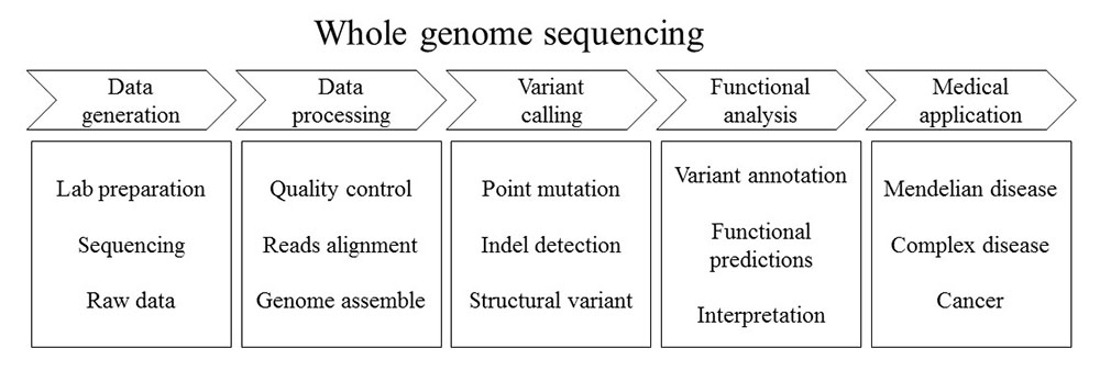 Fundamental improvement was made for genome sequencing since the next-generation sequencing (NGS) came out in the 2000s. The newer technologies make use of the power of massively-parallel short-read DNA sequencing, genome alignment and assembly methods to digitally and rapidly search the genomes on a revolutionary scale, which enable large-scale whole genome sequencing (WGS) accessible and practical for researchers. Nowadays, whole genome sequencing is more and more prevalent in detecting the genetics of diseases, studying causative relations with cancers, making genome-level comparative analysis, reconstruction of human population history, and giving clinical implications and instructions. In this review, we first give a typical pipeline of whole genome sequencing, including the lab template preparation, sequencing, genome assembling and quality control, variants calling and annotations. We compare the difference between whole genome and whole exome sequencing (WES), and explore a wide range of applications of whole genome sequencing for both mendelian diseases and complex diseases in medical genetics. We highlight the impact of whole genome sequencing in cancer studies, regulatory variant analysis, predictive medicine and precision medicine, as well as discuss the challenges of the whole genome sequencing.