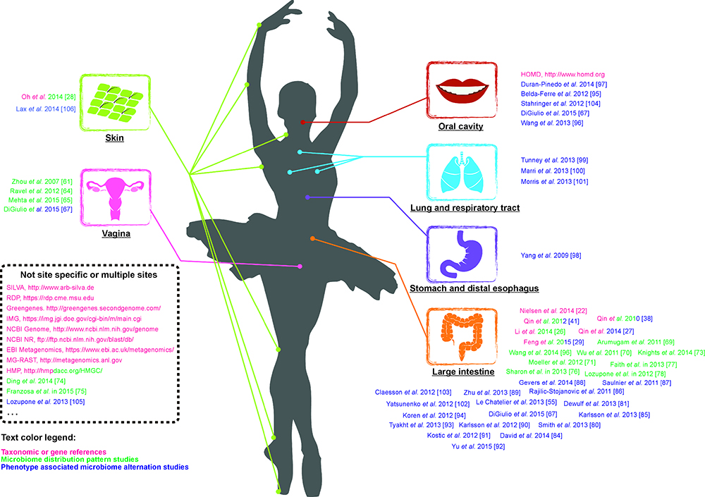 Many microbes are important symbiotes of human. They form specific microbiota communities, participate in various kinds of biological processes of their host and thus deeply affect human health status. Metagenomic sequencing has been widely used in human microbiota study due to its capacity of studying all genetic materials in an environment as a whole without any extra need of isolation or cultivation of microorganisms. Many efforts have been made by researchers in this area trying to dig out interesting knowledge from various metagenome data. In this review, we go through some prominent studies in the metagenomic area. We summarize them into three categories, constructing taxonomy and gene reference, characterization of microbiome distribution patterns, and detection of microbiome alternations associated with specific human phenotypes or diseases. Some available data resources are also provided. This review can serve as an entrance to this exciting and rapidly developing field for researchers interested in human microbiomes.