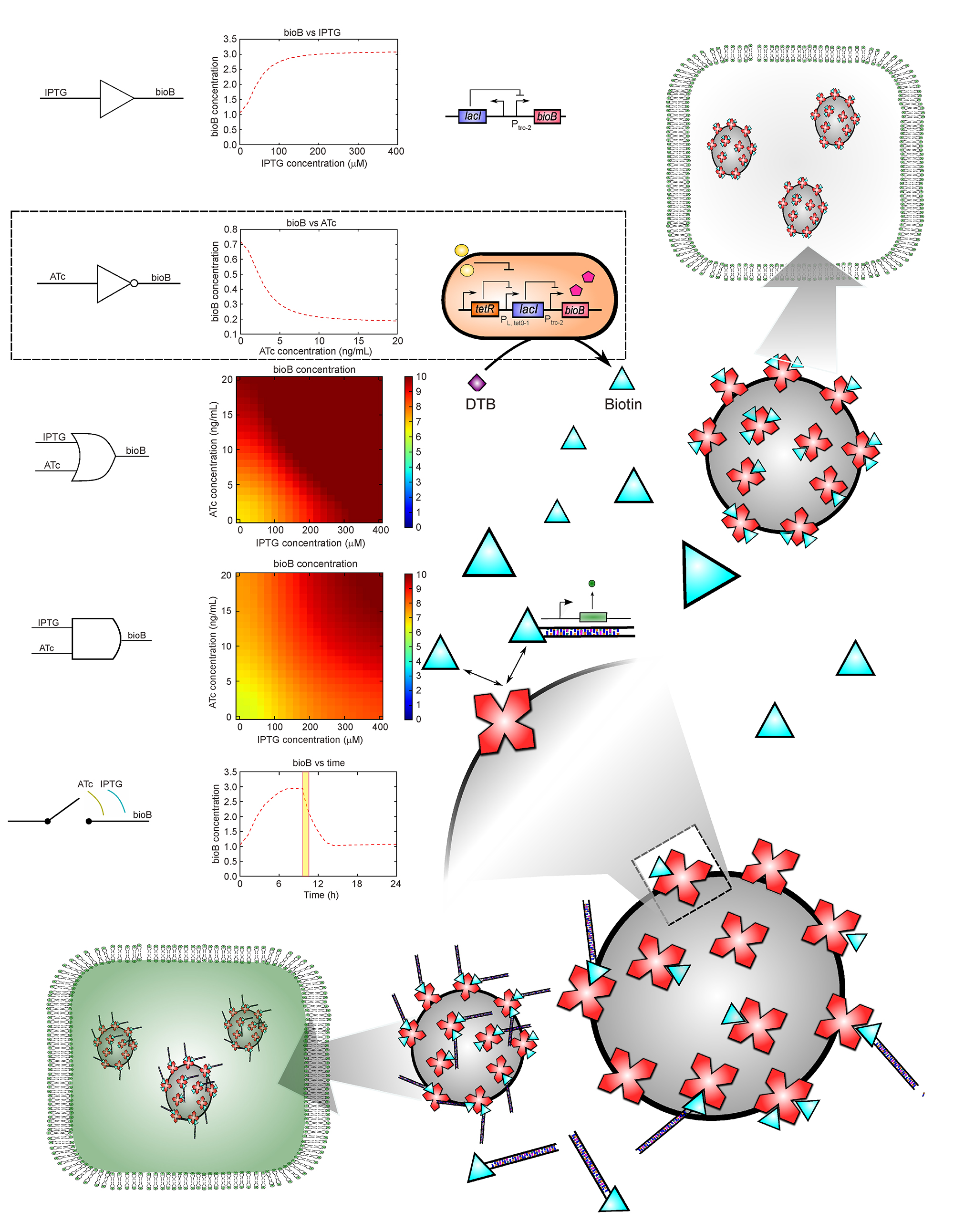 Results: In this specific model, engineered cells are induced to synthesize biotin, which competes with biotinylated, circuit-encoding DNA monomers for an avidinized-microparticle scaffold. We demonstrate that multiple synthetic motifs can be controlled in this way and can be tuned by manipulating parameters such as inducer and DNA concentrations.