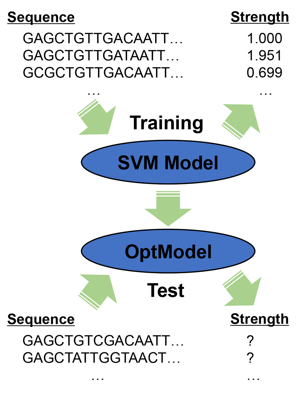 Methods: To confirm this, we constructed SVM based models to quantitatively predict the promoter strength. A library of 100 promoter sequences and strength values was randomly divided into two datasets, including a training set (≥10 sequences) for model training and a test set (≥10 sequences) for model test.