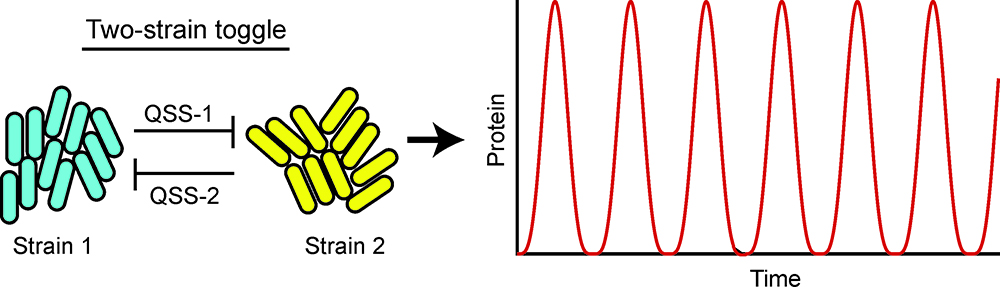 Methods: Here, we used computational modeling to examine how the behavior of synthetic microbial consortia results from the interplay between population dynamics governed by cell growth and internal transcriptional dynamics governed by cell-cell signaling. Specifically, we examined a synthetic microbial consortium in which two strains each produce signals that down-regulate transcription in the other. Within a single strain this regulatory topology is called a “co-repressive toggle switch” and can lead to bistability.