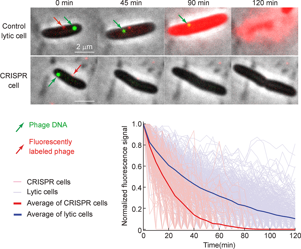 Conclusions: With the CRISPR-Cas visualization system we developed, we are able to examine and characterize how a CRISPR system degrades invading phage DNA at the single-cell level. This work provides direct evidence and improves the current understanding on how CRISPR breaks down invading DNA.