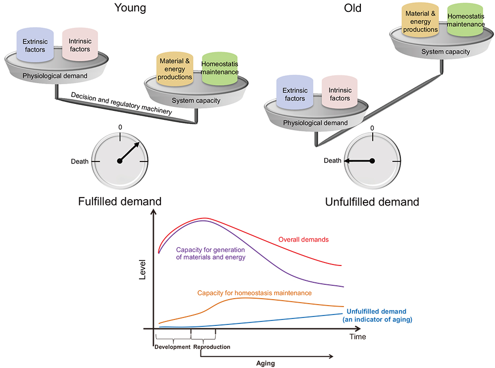 Conclusions: The system capacity model of aging provides an opportunity to examine aging at the systems level. This model predicts that the extent to which aging can be modulated is normally limited by the upper bound of the system capacity of a species. Within such a boundary, aging can be delayed by moderately increasing an individual’s system capacity. Beyond such a boundary, increasing the upper bound is required, which is not unrealistic given the unlimited potential of regenerative medicine in the future, but it requires increasing the capacity of the whole system instead of only part of it.