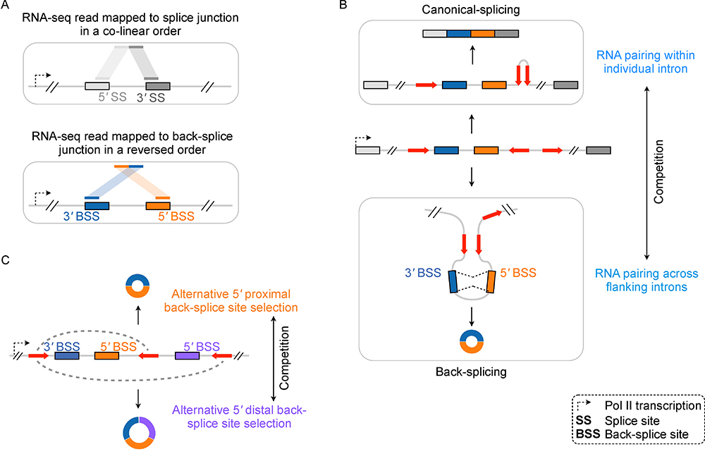 Conclusions: Back-splicing can be significantly facilitated by RNA pair formed by orientation-opposite complementary sequences that juxtapose flanking introns of circularized exon(s). RNA pair formed within individual introns competes with RNA pair formed across flanking introns in the same gene locus, leading to distinct choices for either canonical splicing or back-splicing. Multiple RNA pairs that bracket different circle-forming exons compete for alternative back-splicing selection, resulting in multiple circRNAs generated in a single gene locus.