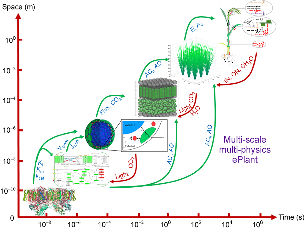 Results: ePlant integrates modules developed for processes occurring at drastically different temporal (10–8–106 seconds) and spatial (10–10–10 meters) scales, incorporating diverse physical, biophysical and biochemical processes including gene regulation, metabolic reaction, substrate transport and diffusion, energy absorption, transfer and conversion, organ morphogenesis, plant environment interaction, etc. Individual modules are developed using a divide-and-conquer approach; modules at different temporal and spatial scales are integrated through transfer variables. We further propose a supervised learning procedure based on information geometry to combine model and data for both knowledge discovery and model extension or advances. We finally discuss the recent formation of a global consortium, which includes experts in plant biology, computer science, statistics, agronomy, phenomics, etc. aiming to expedite the development and application of ePlant or its equivalents by promoting a new model development paradigm where models are developed as a community effort instead of driven mainly by individual labs’ effort.