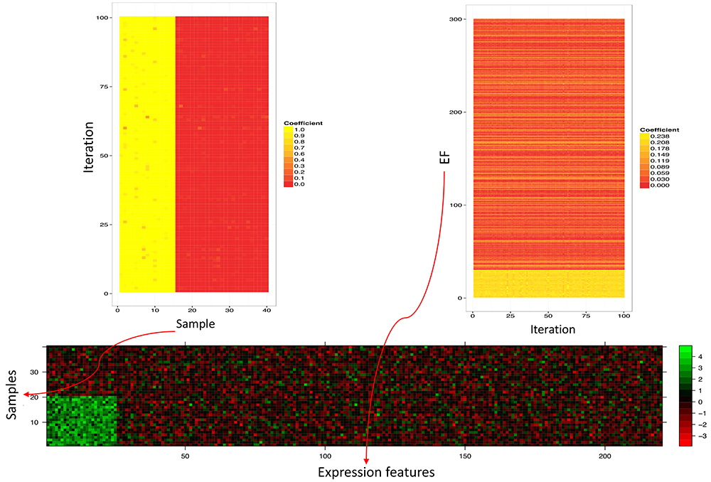 Methods: In this paper, we introduce a new biclustering algorithm to find subsets of genomic expression features (EFs) (e.g., genes, isoforms, exon inclusion) that show strong “group interactions” under certain subsets of samples. Group interactions are defined by strong partial correlations, or equivalently, conditional dependencies between EFs after removing the influences of a set of other functionally related EFs. Our new biclustering method, named SCCA-BC, extends an existing method for group interaction inference, which is based on sparse canonical correlation analysis (SCCA) coupled with repeated random partitioning of the gene expression data set.