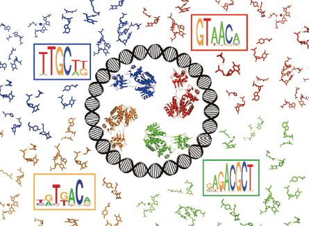 Sequence-specific transcription factors establish a diverse network of protein:DNA contacts to recognize target sites in the genome and fine-tune regulatory output. Closely related proteins within sub-families (e.g., OmpR-family paralogs, profiled in this issue) possess substantial structural and functional similarities, but key “specificity-determining residues” (SDRs) can introduce novel base preferences and global binding modes. This image displays the newly derived binding motifs of four E. coli winged helix-turn-helix transcription factors, surrounded by a su [Detail] ...