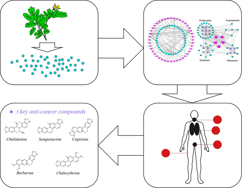 Results: Systems pharmacology analysis demonstrated that C. majus exerted experimental or putative interactions with 18 cancer-associated pathways, and might specifically act on 13 types of cancers. Chelidonine, sanguinarine, chelerythrine, berberine, and coptisine, which are the predominant components of C. majus, may suppress the cancer genes by regulating cell cycle, inducing cell apoptosis and inhibiting proliferation.