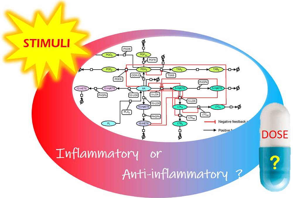 Conclusion: Using the model, we predict that higher dose of HOEC disrupts the flux balance in COX and LOX of the AA network, and increased COX flux can interfere the curative effects of LOX inhibitor on resolution of inflammation which is crucial for the efficient and safe drug design.