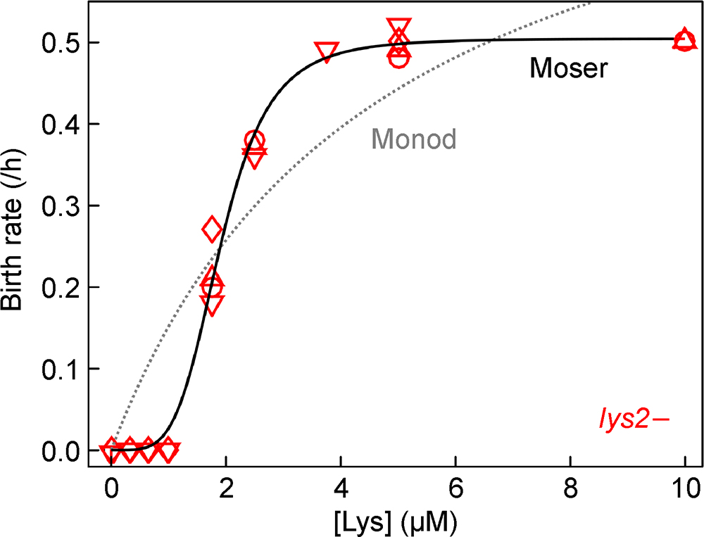Results: For lysine-requiring cells, very low concentrations of lysine are not detectably consumed and do not support cell birth, but delay the onset of death phase and reduce the death rate compared to no lysine. In contrast, in low hypoxanthine, hypoxanthine-requiring cells can produce new cells, yet also die faster than in the absence of hypoxanthine. For both strains, birth rates under various metabolite concentrations are better described by the sigmoidal-shaped Moser model than the well-known Monod model, while death rates can vary with metabolite concentration and time.