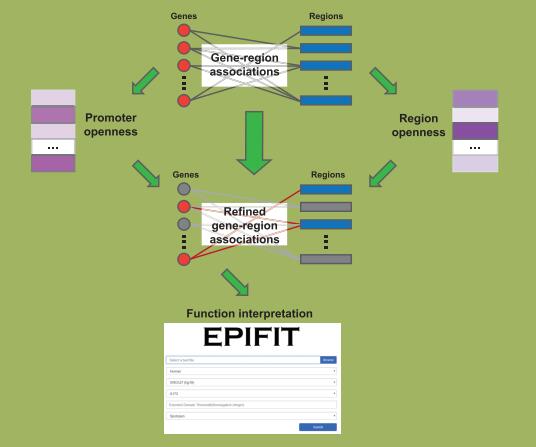 Results: We first examined the chromatin openness correlation between regulatory regions and associated genes. The correlation can help EpiFIT purify regulatory region–gene associations. By evaluating EpiFIT on a set of real data, we demonstrated that EpiFIT outperforms other existing methods for precisely interpreting transcription factor functions. We further verify the efficiency of openness in interpretation and the ability of EpiFIT to build distal region-gene associations.