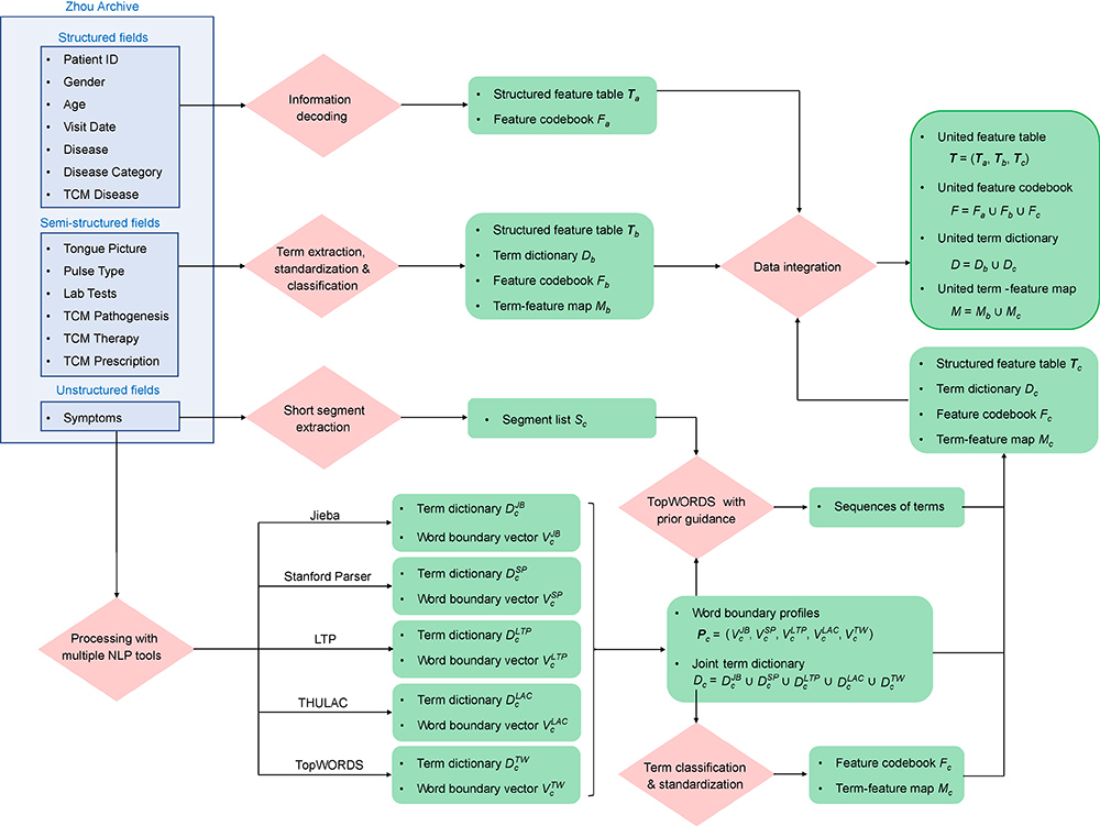Results: A structured feature table of 14,000+ features is generated at the end of the proposed data processing procedure, with a feature codebook, a term dictionary and a term-feature map as byproducts. Statistical analysis of the feature table reveals underlying principles about the diagnosis-treatment model of TCM, helping us better understand the TDM practice from a data-driven perspective.