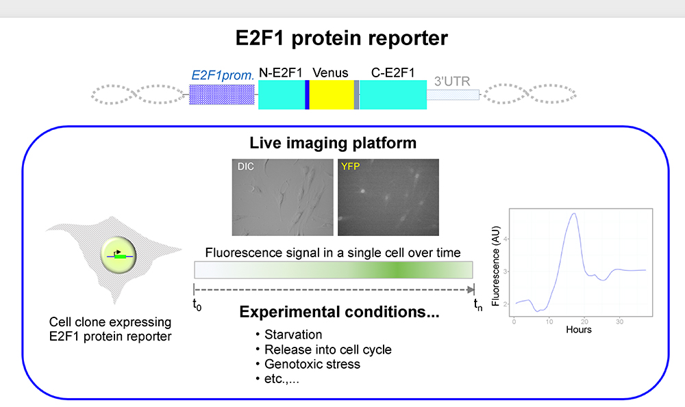 Background: E2F1 protein, a major effector of the Rb/E2F pathway plays a central role in regulating cell-fate decisions involved in proliferation, apoptosis, and differentiation. Its expression is highly dynamic and tightly modulated through a combination of transcriptional, translational and posttranslational controls. However, the mechanisms by which its expression and activity can promote different cellular outcomes remain to be fully elucidated. To better document E2F1 expression in live cells, we have engineered a series of fluorescent E2F1 protein reporters that quantitatively capture E2F1 protein dynamics.