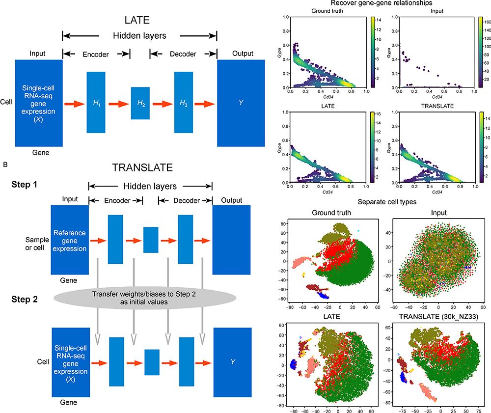 Methods: To overcome this problem, we treat zeros as missing values and develop nonparametric deep learning methods for imputation. Specifically, our LATE (Learning with AuToEncoder) method trains an autoencoder with random initial values of the parameters, whereas our TRANSLATE (TRANSfer learning with LATE) method further allows for the use of a reference gene expression data set to provide LATE with an initial set of parameter estimates.