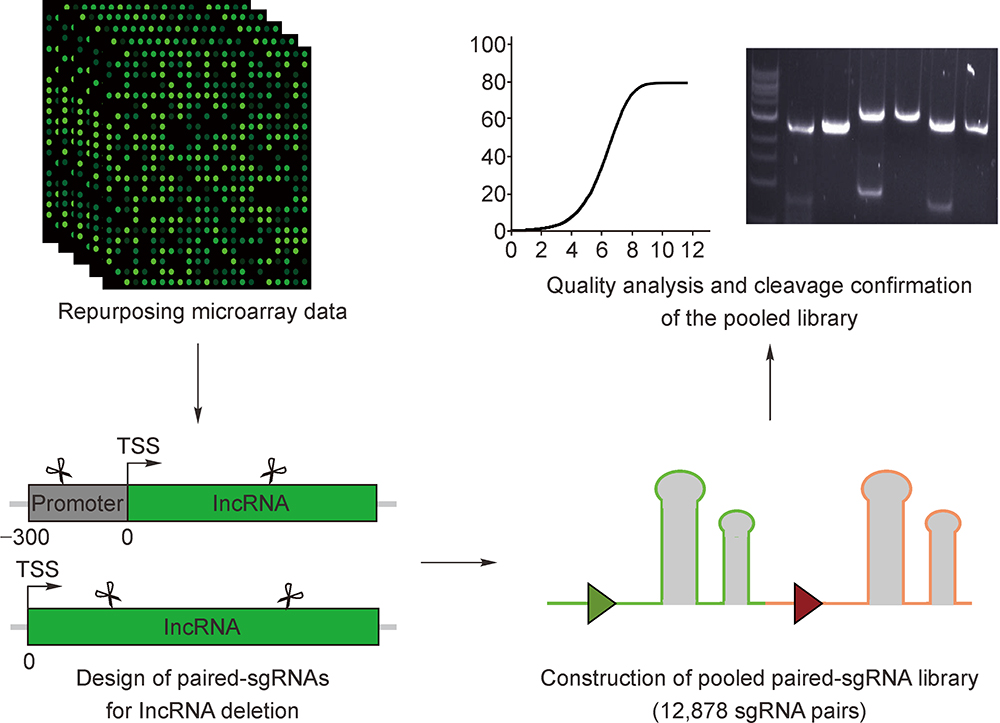 Methods: Here, we presented a systematic strategy for designing a CRISPR-based paired-sgRNA library for high-throughput screening in non-coding regions. Due to the abundance of lncRNAs and their diverse regulatory roles in vivo, we repurposed microarray datasets to select 600 highly expressed lncRNAs in non-small-cell lung cancer and designed two schemes for lncRNA deletion with ~20 paired-sgRNAs for each lncRNA. Through Golden-Gate assembly, we generated a pooled CRISPR-based library with a total of 12,878 sgRNA pairs.