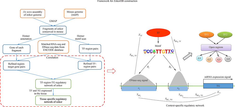 Results: ZokorDB provides a general draft gene regulatory network (GRN), i.e., potential transcription factor (TF) binds to non-coding regulatory elements and regulates the expression of target genes (TG). Furthermore, we refined the GRN by incorporating matched RNA-seq and DNase-seq data from mouse ENCODE project and reconstructed five tissue-specific regulatory networks.