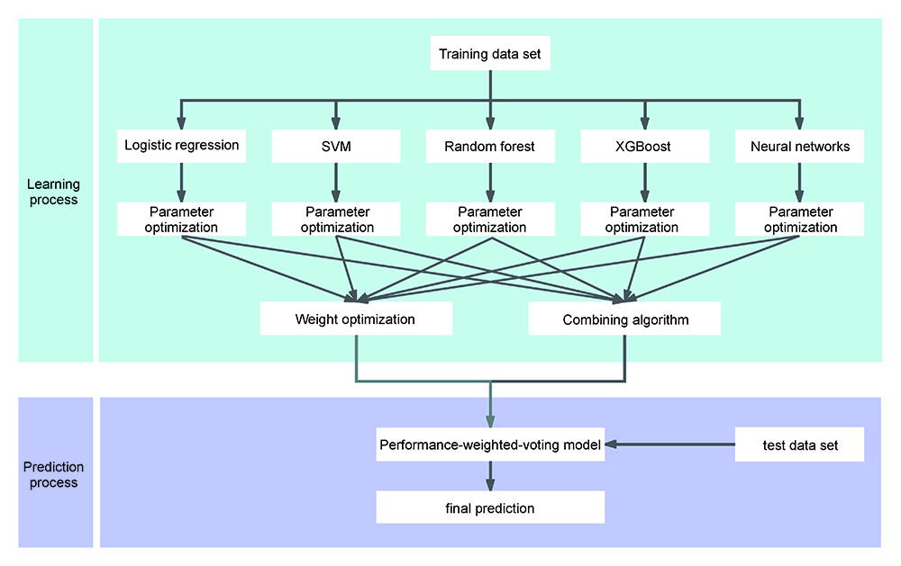 Methods: We developed an ensemble machine learning system named performance-weighted-voting model for cancer type classification in 6,249 samples across 14 cancer types. Our ensemble system consists of five weak classifiers (logistic regression, SVM, random forest, XGBoost and neural networks). We first used cross-validation to get the predicted results for the five classifiers. The weights of the five weak classifiers can be obtained based on their predictive performance by solving linear regression functions. The final predicted probability of the performance-weighted-voting model for a cancer type can be determined by the summation of each classifier’s weight multiplied by its predicted probability.