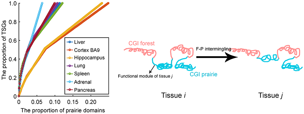 Results: We show that compared to forests, tissue-specific genes tend to be enriched in prairies. Highly specific genes also tend to cluster according to their functions in a relatively small number of prairies. Furthermore, tissue-specific forest-prairie contact formation was associated with the regulation of tissue-specific genes, in particular those in the prairie domains, pointing to the important role of gene positioning, in the linear DNA sequence as well as in 3D chromatin structure, in gene regulatory network formation.