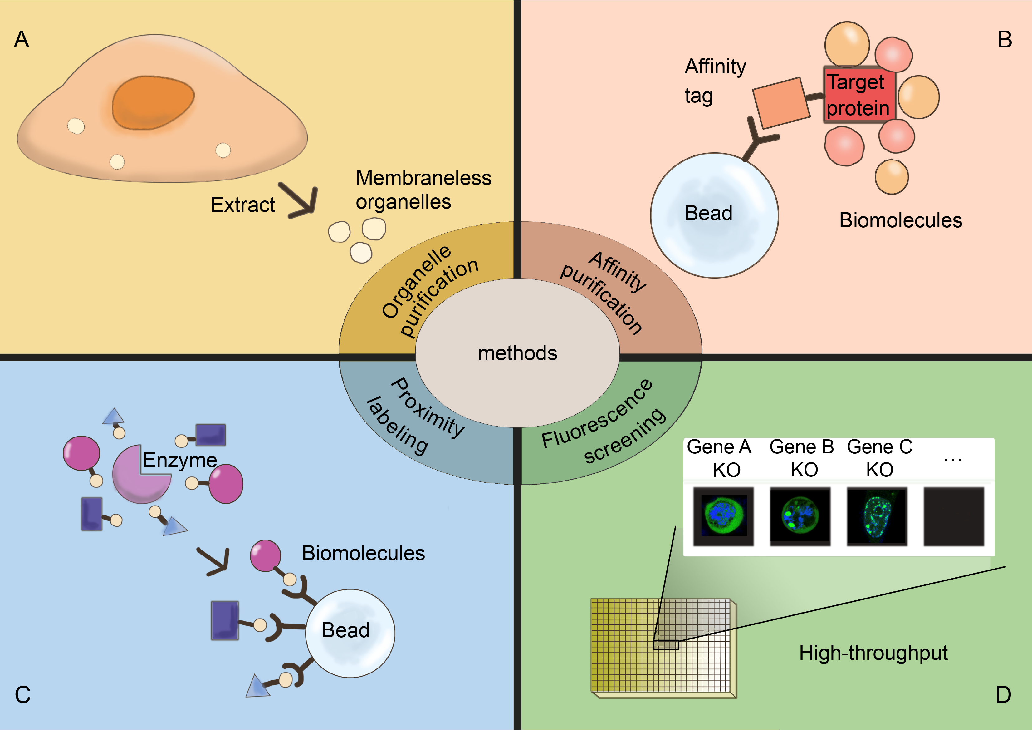 Results: Since a wide range of macromolecules comprise biomolecular condensates, it is necessary for researchers to investigate them using high-throughput methodologies while low-throughput experiments are not efficient enough. These high-throughput methods usually purify interacting protein libraries from condensates before being scanned in mass spectrometry. It is possible to extract organelles as a whole for specific condensates for further analysis, however, most condensates do not have a distinguishable marker or are sensitive to shear force to be extracted as a whole. Affinity tagging allows a comprehensive view of interacting proteins of target molecule yet only proteins with strong bonds may be pulled down. Proximity labeling serves as a complementary method to label more dynamic proteins with weaker interactions, increasing sensitivity while decreasing specificity. Image-based fluorescent screening takes another path by scanning images automatically to illustrate the condensing state of biomolecules within membraneless organelles, which is a unique feature unlike the previous mass spectrometry-based methods.