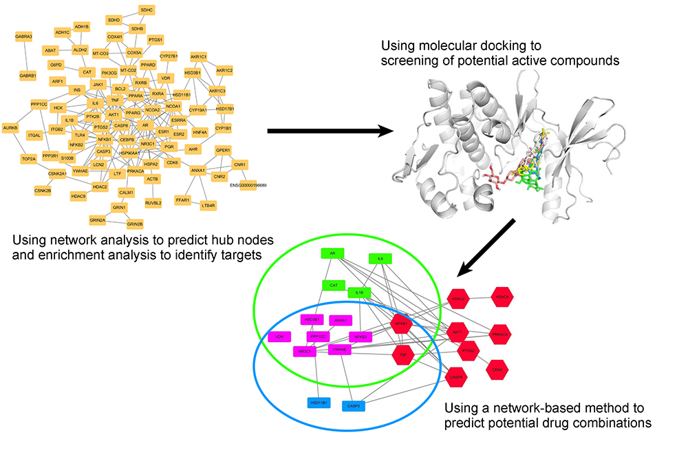 Methods: We applied a comprehensive network pharmacology approach to explore the key mechanisms of YDJ by integrating potential target identification, network analysis, and enrichment analysis into classical molecular docking procedures. First, we used network and enrichment analyses to identify potential therapeutic targets. Second, we performed molecular docking to investigate the potential active compounds of YDJ. Finally, we carried out a network-based analysis to unravel potentially effective drug combinations.