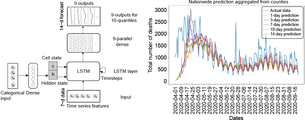 Methods: We developed the long short-term memory networks with quantile output (condLSTM-Q) model for making quantile predictions on COVID-19 death tolls.