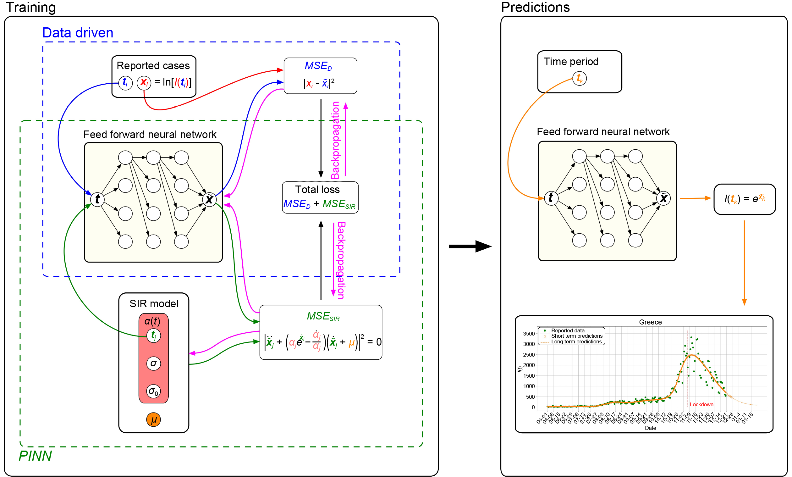 Results: Quantitative machine learning analysis is applied to eight countries with infection data from the first viral wave. We find as two extremes Greece and USA where the measures were successful and unsuccessful, respectively, in limiting spreading. This physics-based neural network approach is employed to the second wave of the infection, and by training the network with the new data, we extract the time-dependent infection rate and make short-term predictions with a week-long or even longer horizon. This algorithmic approach is applied to all eight countries with good short-term results. The data for Greece is analyzed in more detail from August to December 2020.