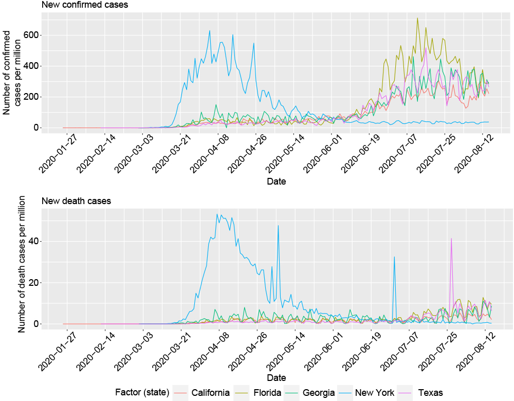 Conclusions: The results obtained by applying the functional data analysis methods provide new insights into the COVID-19 data in the United States. With our results and recommendations, the health professionals can make better decisions to reduce the spread of the epidemic, and mitigate its negative effects to the national public health.