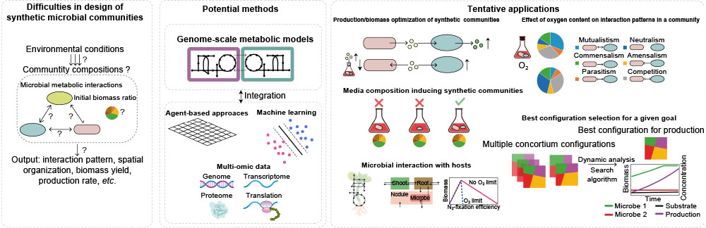 Conclusions: Although at the infancy stage, GEM-based approaches exhibit an increasing scope of applications in designing synthetic microbial communities. Compared to other methods, especially the use of laboratory cultures, GEM-based approaches can greatly decrease the trial-and-error cost of various procedures for designing synthetic communities and improving their functionality, such as identifying community members, determining media composition, evaluating microbial interaction potential or selecting the best community configuration. Future efforts should be made to overcome the limitations of the approaches, ranging from quality control of GEM reconstructions to community-level modeling algorithms, so that more applications of GEMs in studying phenotypes of microbial communities can be expected.