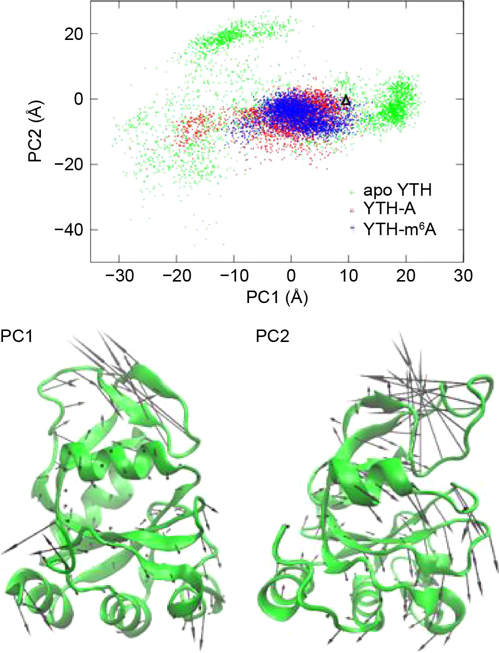 Conclusion: The results are in good agreement with higher structural stability of the YTH-m6A RNA than that of the YTH-A3 RNA. The addition of a methylation group on A3 can enhance its binding to the hydrophobic pocket in the YTH domain. Our simulations support a ‘conformational selection’ mechanism between the YTH-RNA binding. This work may aid in our understanding of the structural and dynamic characteristics of the YTH protein in complex with the methylated RNA.