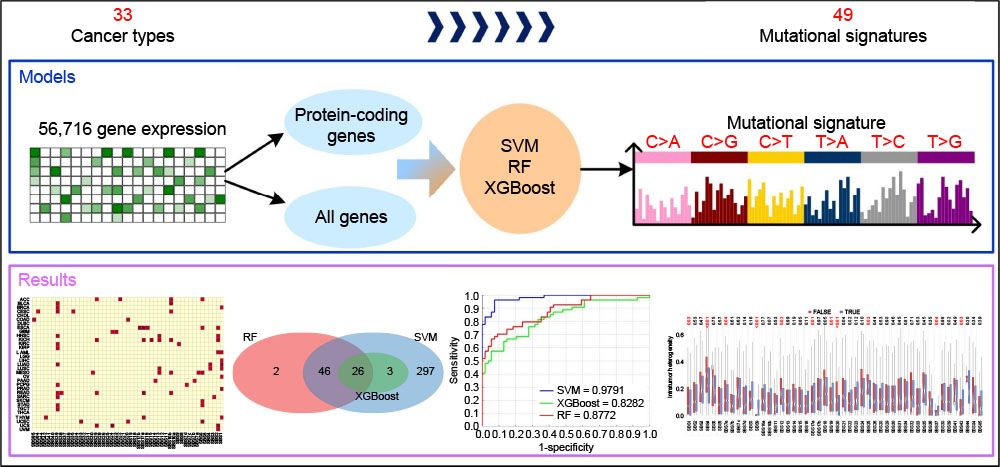 Methods: We hypothesized that there are potential associations between mutational signature and gene expression. We capitalized upon RNA-seq data to model 49 established mutational signatures in 33 cancer types. Both accuracy and area under the curve were used as performance measures in five-fold cross-validation.