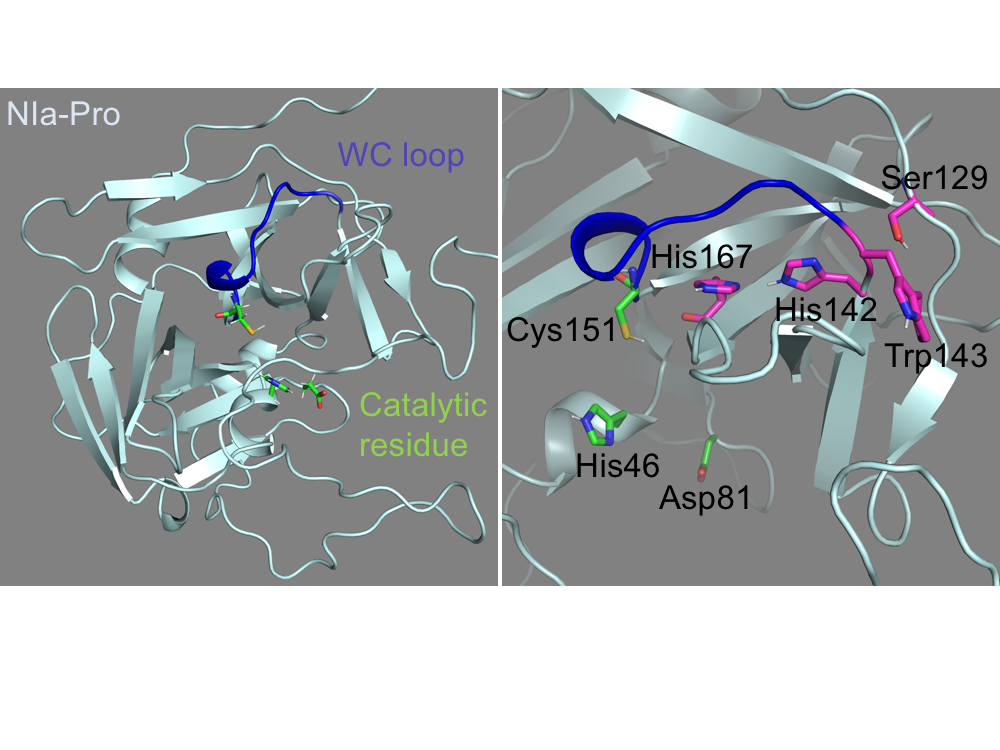 Conclusion: Our mutagenic study delineates the allosteric pathway and facilitates the understanding of the modulation of NIa-Pro activity on a molecular level in the absence of the structure of its complex with the known regulator VPg. Additionally, our in silico analysis explains the molecular concepts and highlights the dynamics behind the previously reported wet lab study findings.